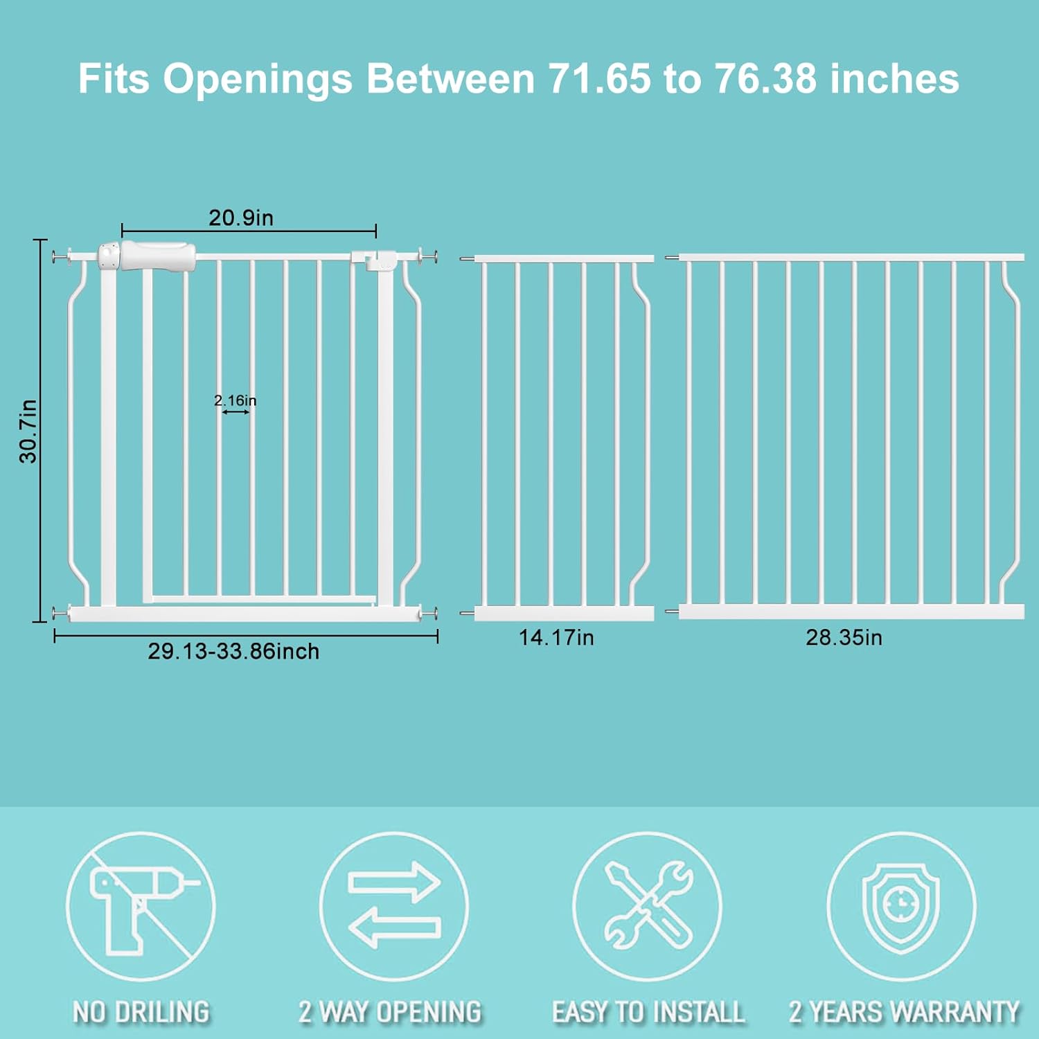 WAOWAO Baby Gate 71.65-76.35" Extra Wide Pressure Mounted Walk Through Swing Auto Close Safety White Metal Toddler Kids Child Dog Pet Puppy for Stairs,Doorways,Kitchen