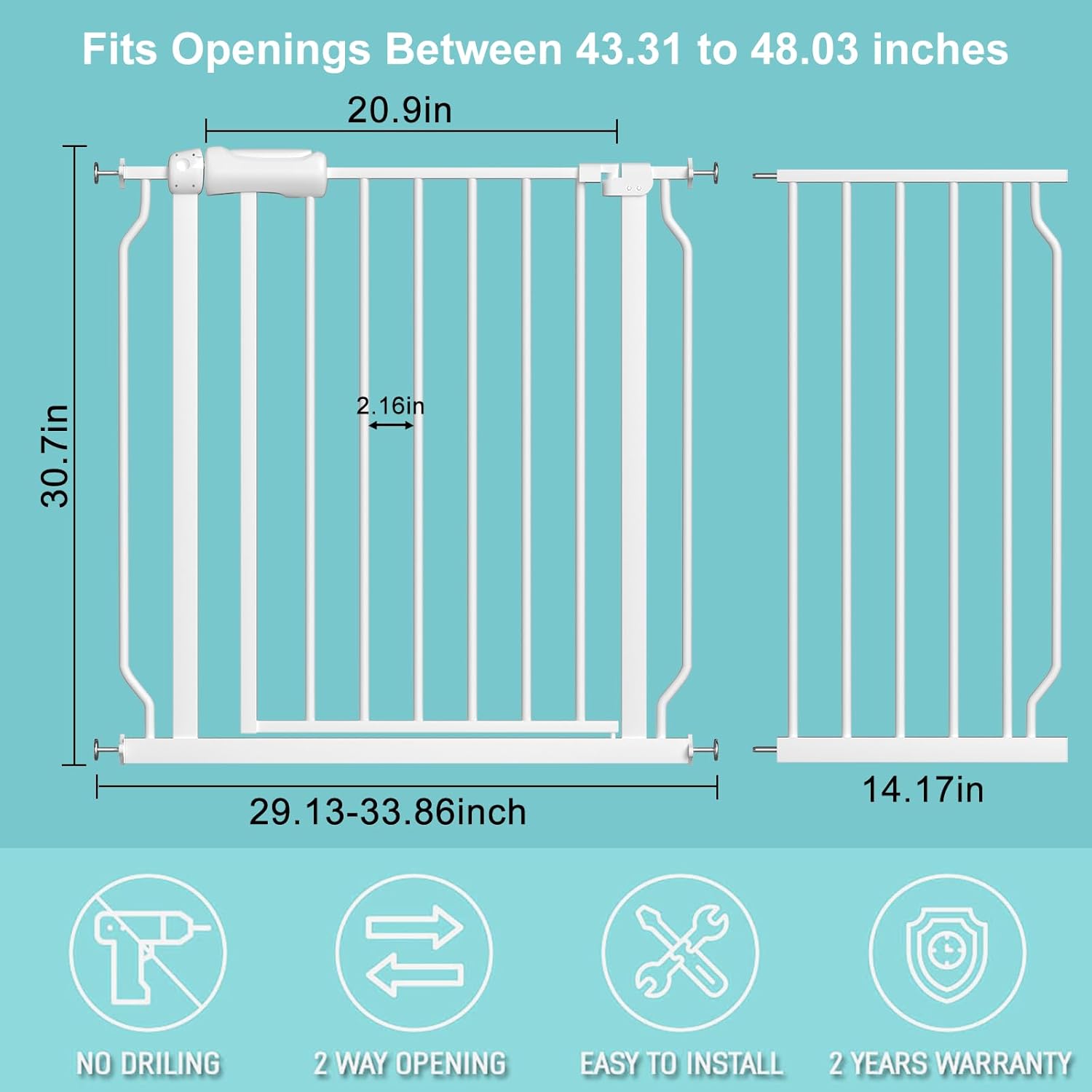 WAOWAO Baby Gate 43.31-48.00" Extra Wide Pressure Mounted Walk Through Swing Auto Close Safety White Metal Toddler Kids Child Dog Pet Puppy for Stairs,Doorways,Kitchen