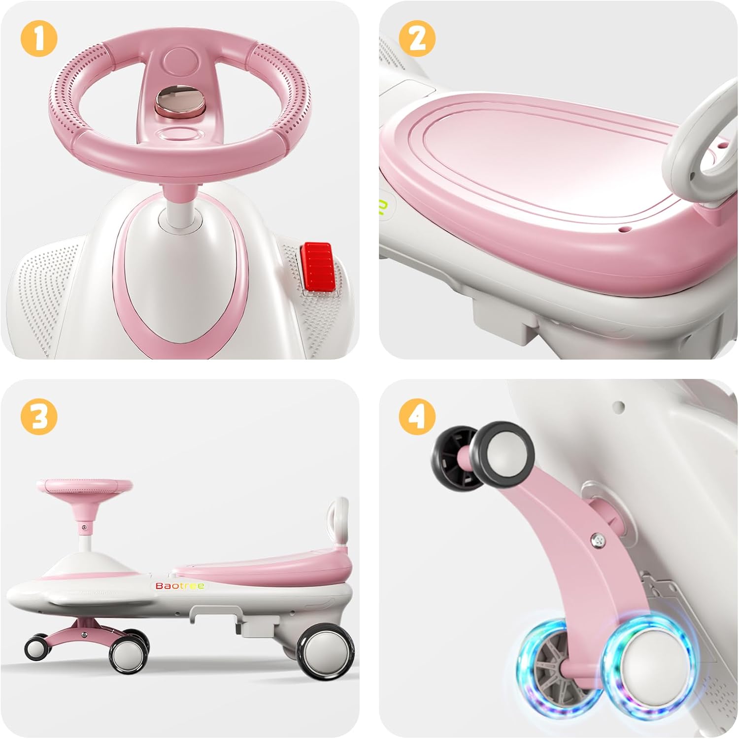- 🎵 4D interactive entertainment system Exclusively configured with engine roar sound effects + 7-color gradient LED atmosphere lights, the steering wheel has a built-in Bluetooth speaker that can connect to the phone to play nursery rhymes/stories, and stimulate children's role-playing creativity.
