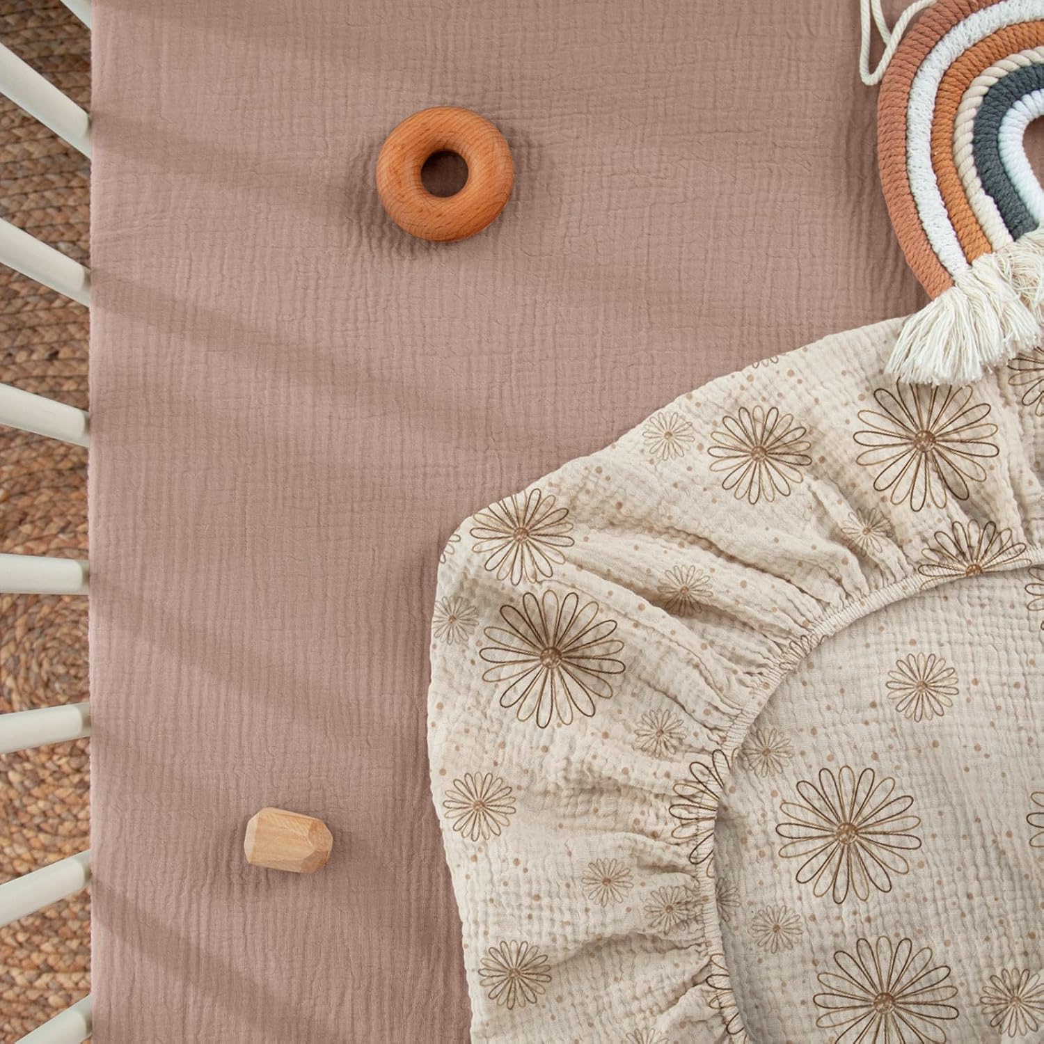 - Muslin Cotton: The muslin mini crib sheets are soft and breathable to give your baby a cozy place to sleep. They make a smoother transition from snuggled in your arms to safely sleeping in their mini crib.