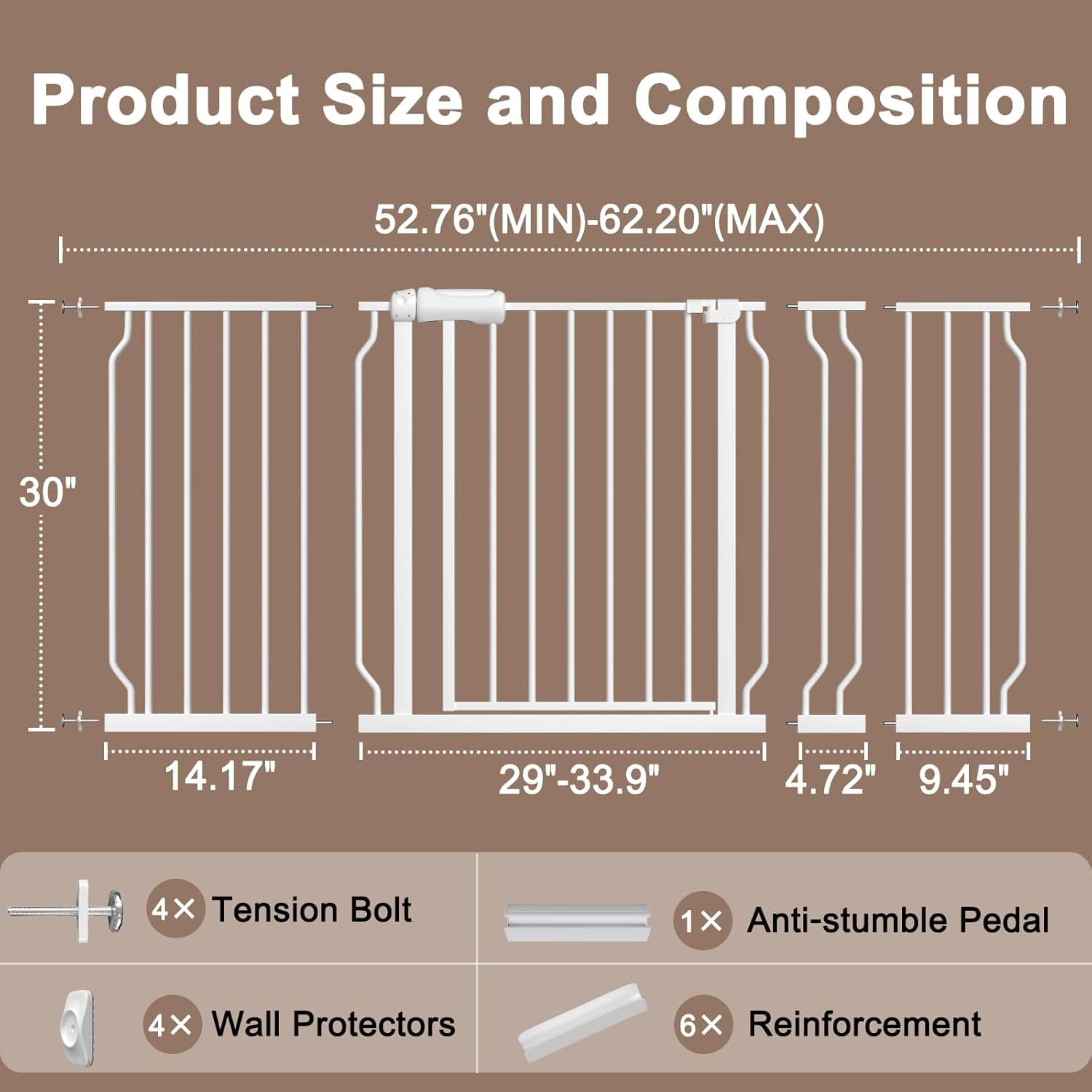 - 【Multi Use】Tension walk through baby gate for stairs, doorways, kitchen and hallways to stop babies,child or pets climb over. Fitsopenings from 29.13 inch to 109.44 inch,please measure the opening size before purchasing. Tips: before installation there will be a gap between the wide gate latch and the frame which is NOT a defect and it is NOT bent. This gap will be eliminated once installed