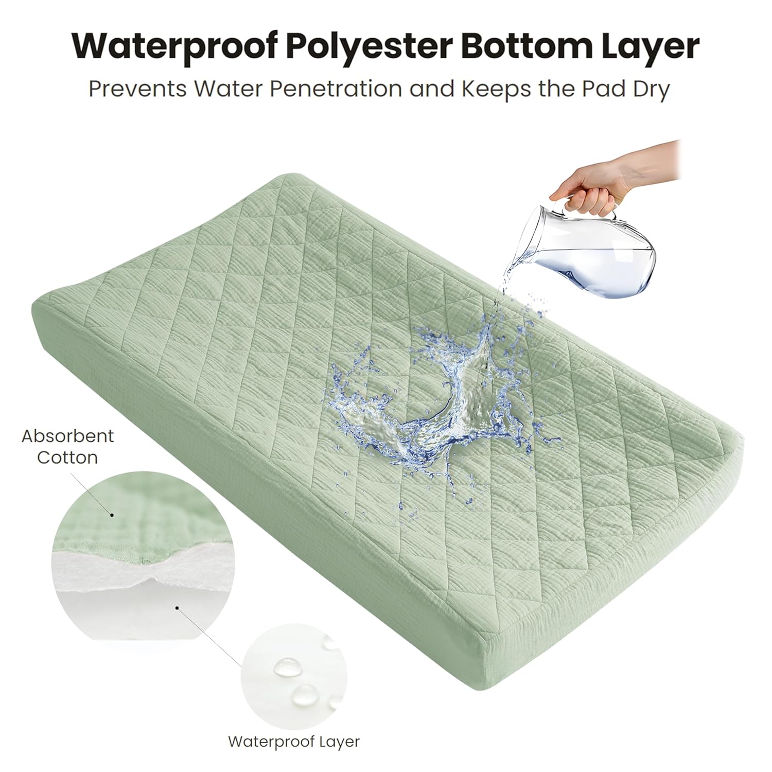 - Quilted and Soft Fabric: Our changing pad cover consists of three layers: the top layer is made of 100% cotton (muslin), which is soft and absorbent; the middle layer is quilted with soft padding to ensure coziness and comfort; and the bottom layer is made of 100% waterproof polyester to protect the pad from wetting. Our unique design provides a comfortable touch for your baby while ensuring waterproof functionality, making our changing pad soft and perfect for delicate baby skin.